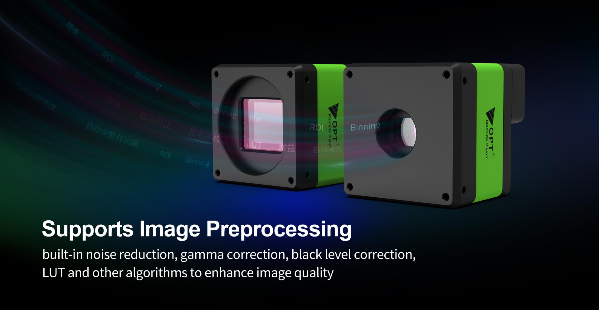 The area scan cameras also feature ISP image preprocessing algorithms embedded in the FPGA chip, supporting functions such as automatic gain, automatic exposure, sharpening, noise reduction, brightness and contrast adjustment, gamma correction, black level correction, and LUT. These functions process and optimize raw image signals to improve image quality, significantly reducing the difficulty of image analysis by vision software.