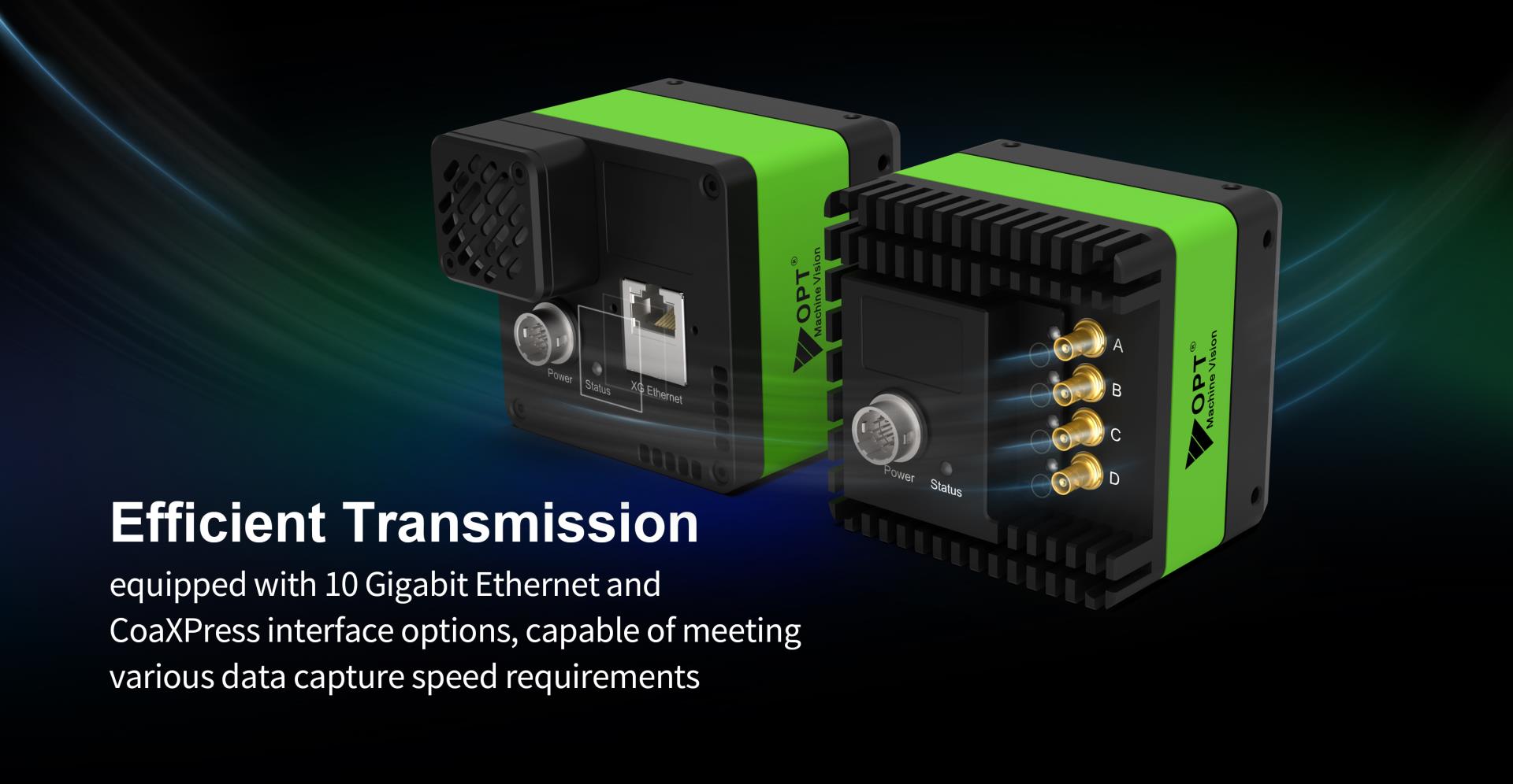 Based on 10GigE and CXP interface technologies, OPT has launched new series of 10GigE and CXP area scan cameras. These cameras feature larger sensor sizes and integrate ISP image preprocessing algorithms within the FPGA chip, providing both high resolution and efficient transmission. They meet the demands for higher precision and speed in visual inspection.